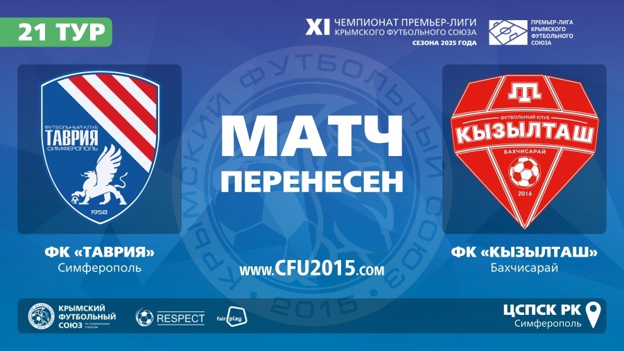 Матч 21-го тура чемпионата Премьер-лиги Крымского футбольного союза между ФК "Таврия" (Симферополь) и ФК "Кызылташ" (Бахчисарай), запланированный на 28 сентября 2025 года, перенесен на резервный день. Соответствующее решение принял Комитет по проведению соревнований КФС. О новой дате проведения матча будет сообщено дополнительно.