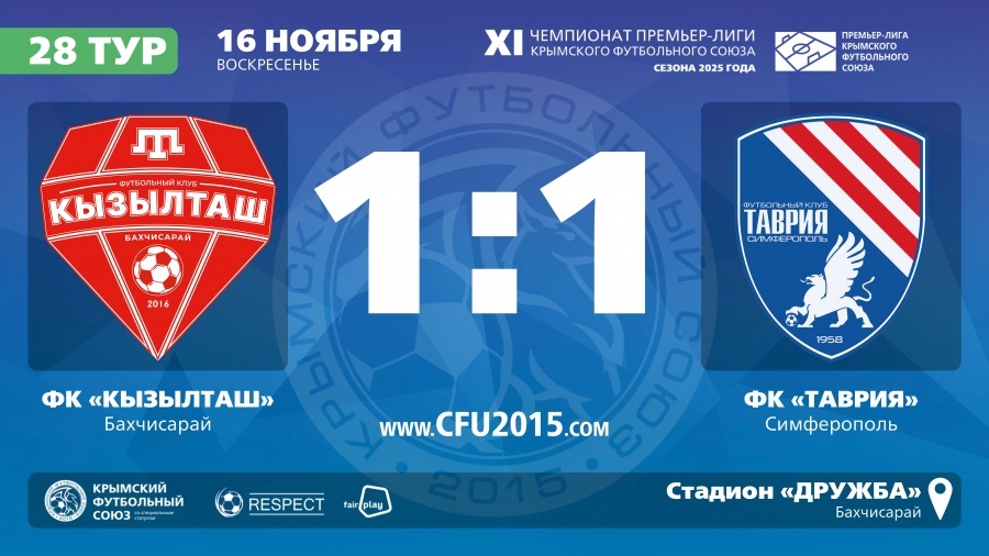 16 ноября 2025 года. Бахчисарай. Стадион "Дружба". 2150 зрителей. Оценка поля – 4. Чемпионат Премьер-лиги Крымского футбольного союза (сезон 2025). 28-й тур