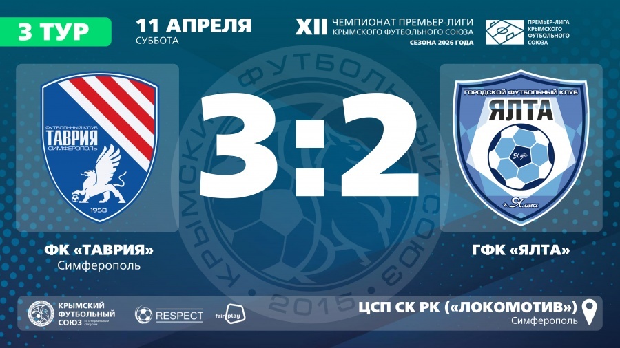 11 апреля 2026 года. Симферополь. ЦСПСК РК. 300 зрителей. Оценка поля – 5. Чемпионат Премьер-лиги Крымского футбольного союза (сезон 2026). 3-й тур